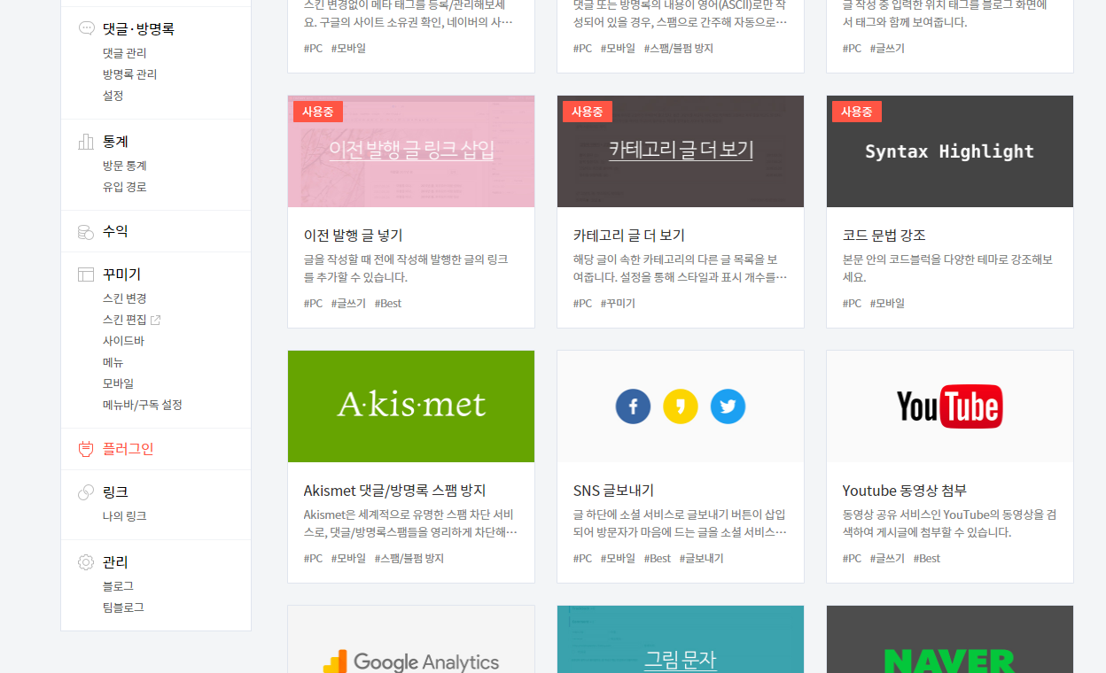 관리자로 들어가시면 '플러그인' 메뉴로 들어갈 수 있는데요.