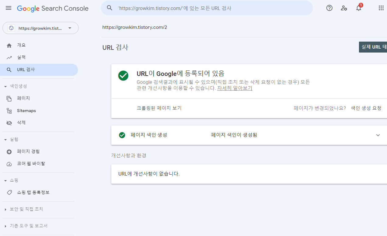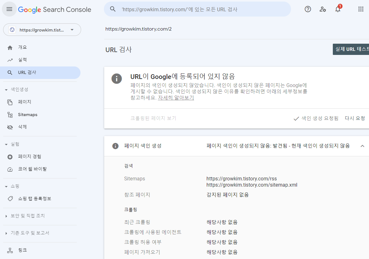 연결을 완료하신 다음 서치콘솔로 들어가봅니다.