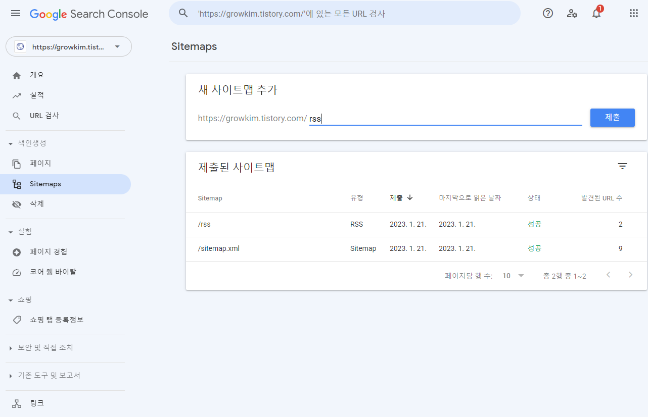 그리고 아래 이미지대로 RSS와 사이트맵을 제출하면 완료가 됩니다.