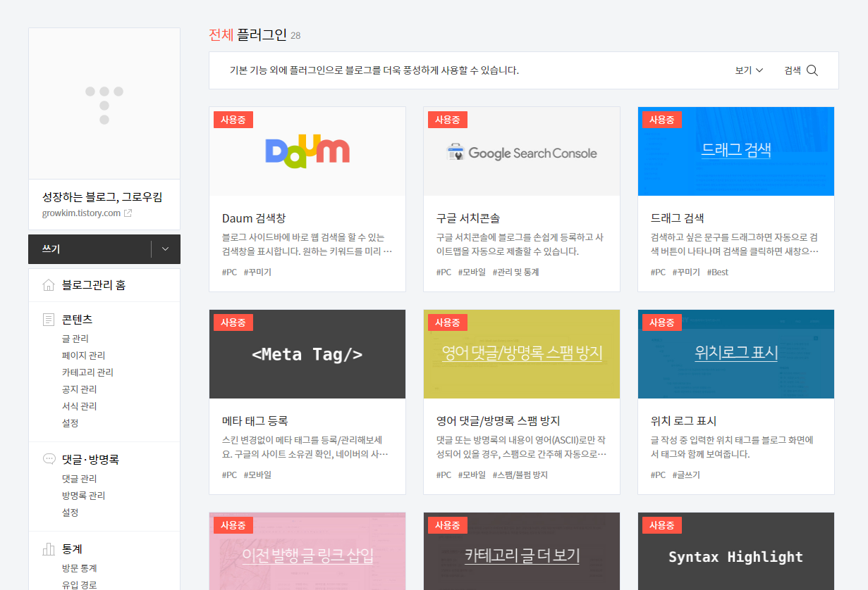티스토리는 친절하게도 구글의 검색 등록을 플러그인 형태로 쉽게 설정할 수 있도록 지원하고 있습니다.