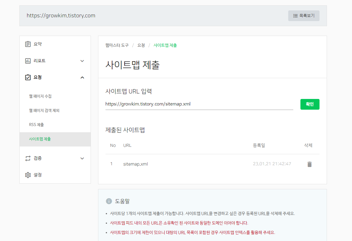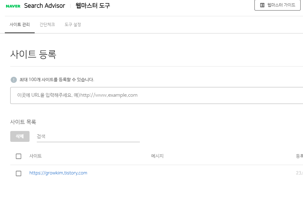 로그인 후 웹마스터 도구의 사이트 등록에 자신의 티스토리 url을 등록합니다.