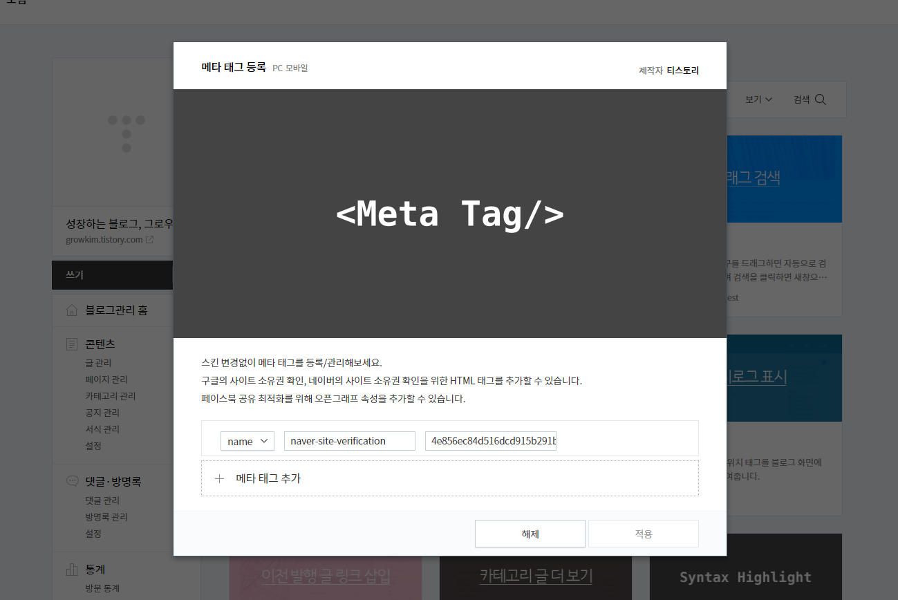 그리고 나서 사이트 소유 확인을 해야하는데, 관리자 툴의 플러그인-메타태그에서 쉽게 등록하여 진행할 수 있습니다.