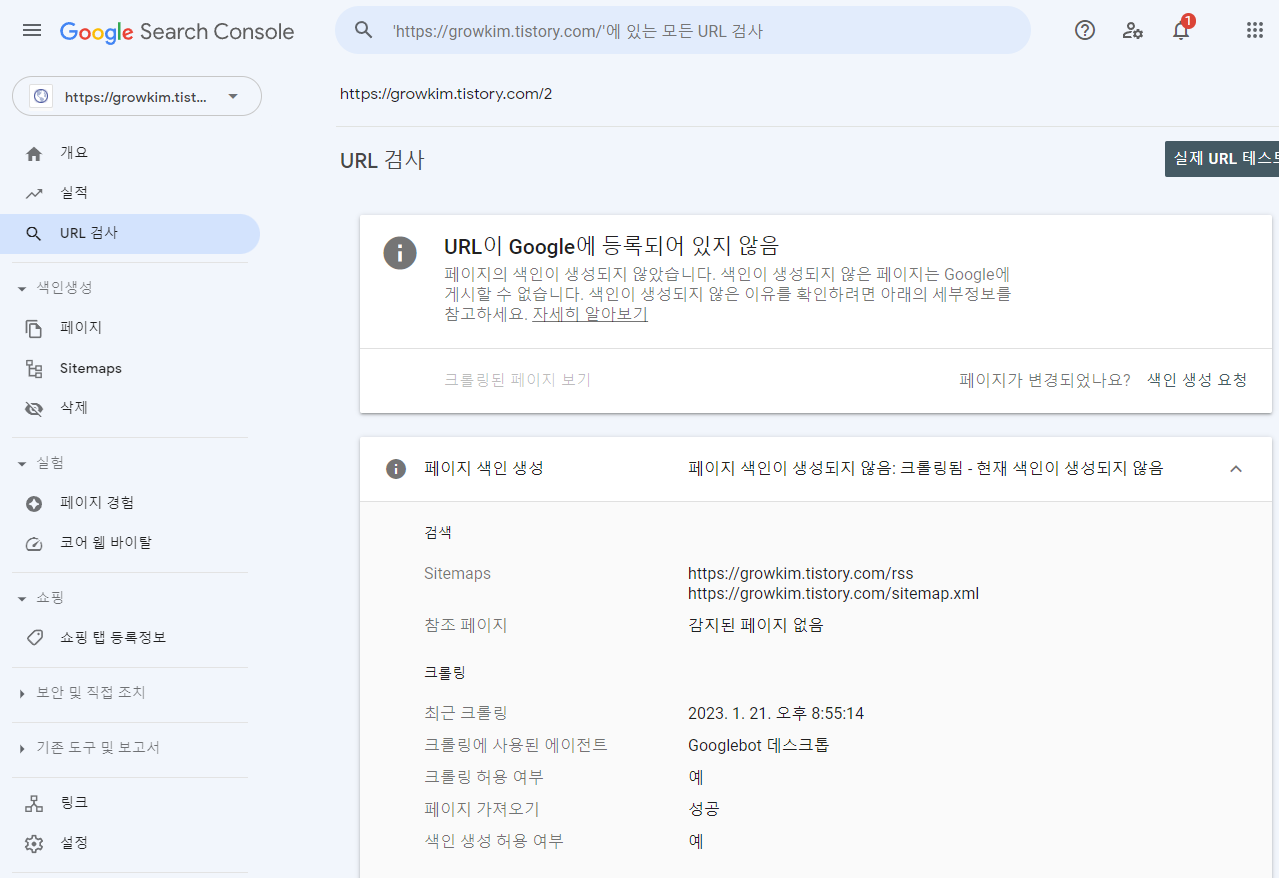 그리고 난 다음 URL 검사 메뉴로 가셔서 내가 발행한 글을 넣어서 테스트를 해봅니다.